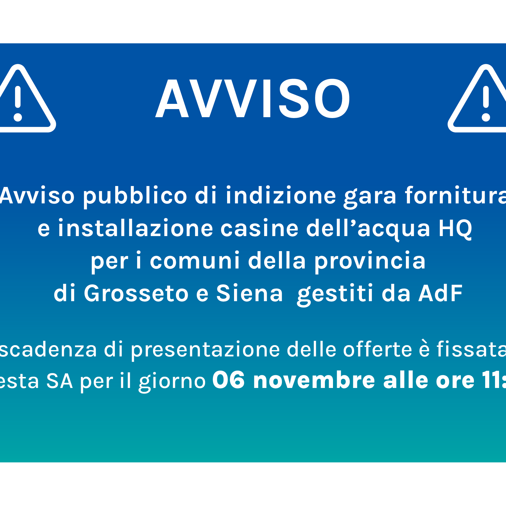 Avviso pubblico di indizione gara fornitura e installazione Casine dell’Acqua HQ per i comuni della provincia di Grosseto e Siena gestiti da AdF News10 Ottobre 2024 Dettagli