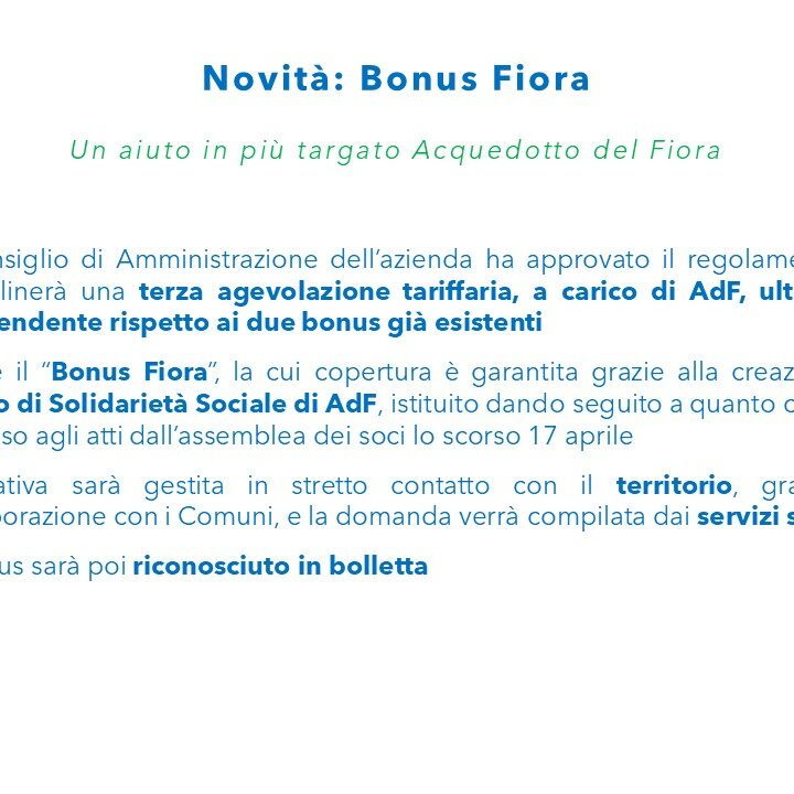 Approvato dal CdA il regolamento del Fondo di Solidarietà Sociale di AdF: nasce il Bonus Fiora per aiutare chi si trova in situazioni di disagio socioeconomico, che si aggiunge al Bonus Sociale Idrico (nazionale) e al Bonus Idrico Integrativo (regionale)